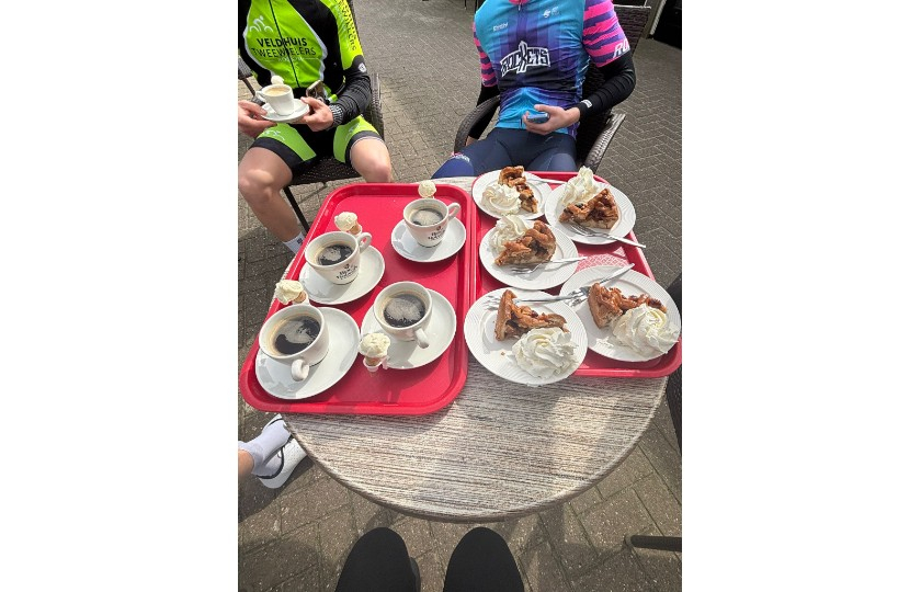 Gisteren een mooie trainingsrit gemaakt richting onze Alpe d’HuZes uitdaging. Kilometers maken, zweten en doorzetten… maar ook genieten van de kleine dingen, zoals een welverdiend stukje appeltaart onderweg 😄