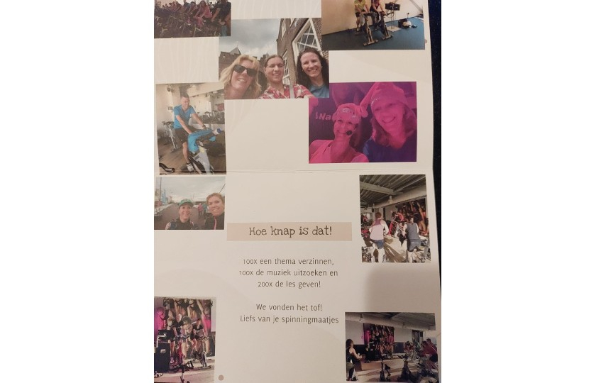 En toen kwam United by… nummer 100. De deelnemers gaven hun favoriete liedjes door, ik maakte de les. Ik had een top gekocht met 100 erop, het was immers een mijlpaal. Die top heb ik nooit aangehad, want Nathalie organiseerde met een paar vriendinnen een prachtig verrassingsfeestje. Ballonnen, kaartjes en een top, speciaal laten maken voor de gelegenheid. Ik trok hem aan en hij paste perfect. Nathalie telde af en de vriendinnen, met Mau, trokken hun jasjes uit en onthulden dezelfde top. Ik was overdonderd. De hele les was het feest. We liepen de polonaise op het liedje van Mau, Land van Maas en Waal. We zongen en zweetten en genoten.