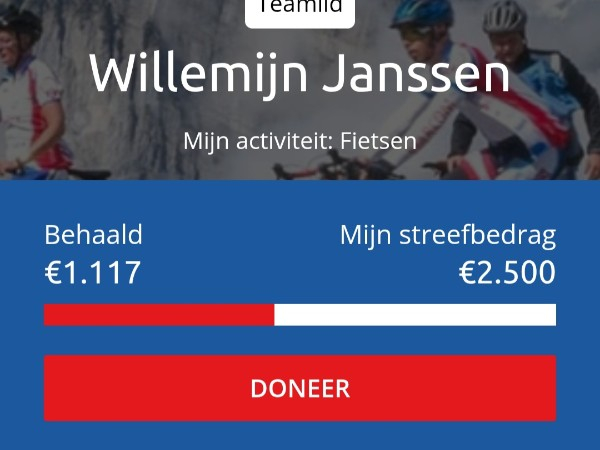 Hoi Willemijn, ik vind het erg knap dat je de strijd aangaat met deze berg. En de ondersteuning voor de kankerbestrijding, super! Heel veel succes, zet 'm op. Groetjes, Tiny