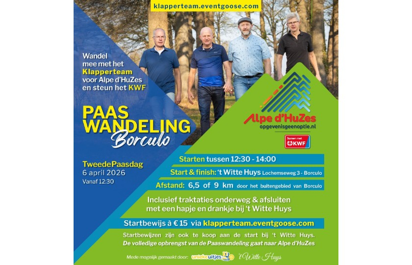 De opbrengst van de wandeling gaat volledig naar 𝐀𝐥𝐩𝐞 𝐝'𝐇𝐮𝐳𝐞𝐬. Om te kunnen starten koop je een ticket via deze webshop als startbewijs , deze wordt bij de start gescand. Op de dag zelf kunt u zich ook ter plekke opgeven. Deelnemers kunnen die dag tussen 12.30 en 14 uur starten voor een fraaie wandeltocht door het buitengebied van Borculo. De afstanden zijn 6,5 en 9 kilometer. Start en finish is bij ’t Witte Huys in Borculo. De kosten bedragen 15 euro per persoon, dat is inclusief allerlei hapjes en drankjes onderweg. Het evenement wordt mede mogelijk gemaakt door ondersteuning van ’t Witte Huys en Unieke Uitjes.