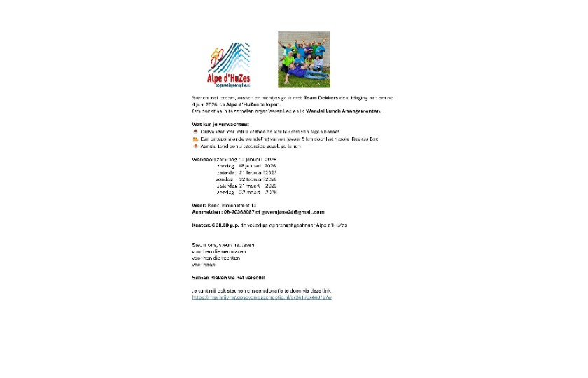 Wij doen als team mee aan Alpe d’HuZes omdat wij als familie graag willen dat er veel geld komt voor onderzoek dat er uiteindelijk voor zorgt dat mensen van wie we houden niet meer dood hoeven te gaan aan deze ziekte. Wij geloven dat wij samen kunnen helpen om dit een steeds meer mogelijk te kunnen maken, wil jij ons steunen?